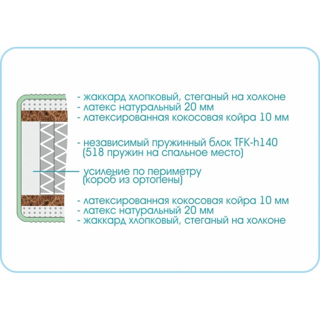 Наполнение: независимый блок TFK, высота блока 140 мм, латекс 20 мм с двух сторон, кокосовая плита 10 мм с двух сторон, усиление по периметру - короб из ортопены.