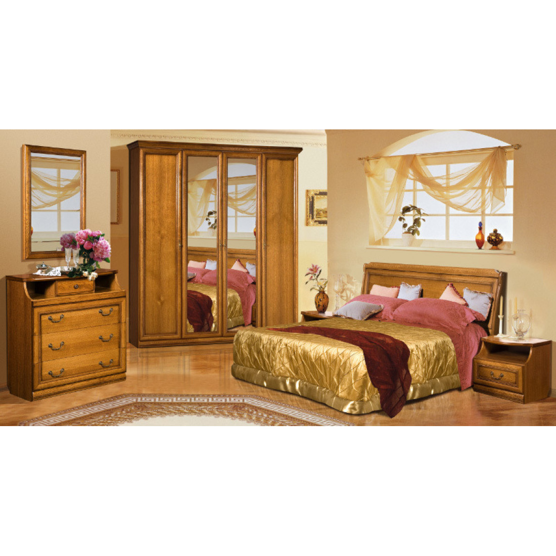 Изделие изготовлено из плиты древесностружечной, крышки – из плиты МДФ облицованы шпоном строганным дуба. Декоративные бруски на дверях шкафа, стенках передних ящиков и спинках кровати, карниз и цоколь шкафа, вертикальные опорные бруски кровати из массива древесины дуба. Спальня выполнена в цвете "Табак с темной патиной".